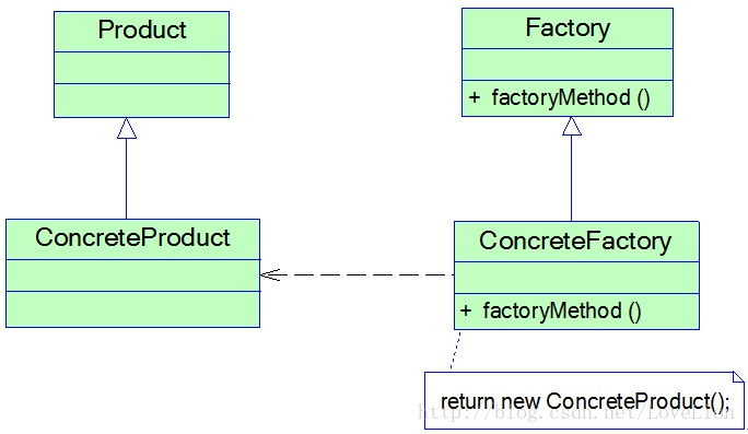 - 客户端不知道它所需要的对象的类。在工厂方法模式中,客户端不需要知道具体产品类的类名,只需要知道所对应的工厂即可,具体的产品对象由具体工厂类创建,可将具体工厂类的类名存储在配置文件或数据库中。