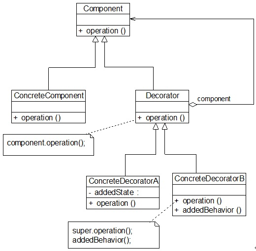 Decorator(抽象装饰类):它也是抽象构件类的子类,用于给具体构件增加职责,但是具体职责在其子类中实现。它维护一个指向抽象构件对象的引用,通过该引用可以调用装饰之前构件对象的方法,并通过其子类扩展该方法,以达到装饰的目的。