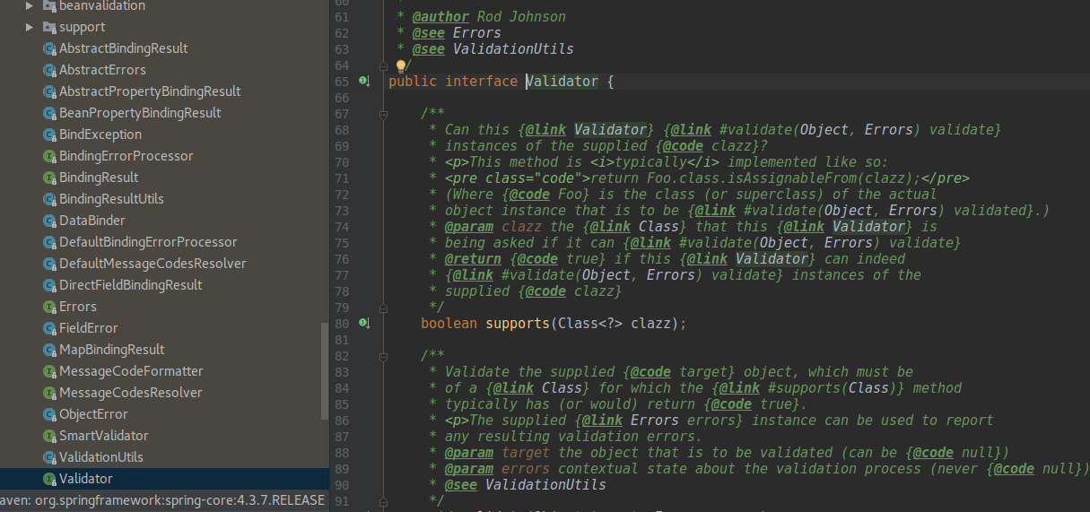 supports(Class)- Can thisValidatorvalidate instances of the suppliedClass?validate(Object, org.springframework.validation.Errors)- validates the given object and in case of validation errors, registers those with the givenErrorsobject